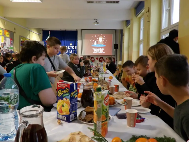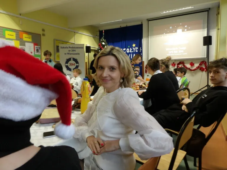 „22 grudnia w Naszej Szkole odbyło się spotkanie świąteczno – noworoczne. Uczniowie klasy 5 A, pod kierunkiem Pani Katarzyny Badury, przygotowali i nagrali życzenia dla całej Szkoły. Pani Beata Warowna – Niemyjska opowiedziała o tradycjach świątecznych i znaczeniu Świąt dla relacji między ludźmi. Dzięki zastosowaniu sztucznej inteligencji życzenia całej społeczności szkolnej złożył św. Mikołaj. Wszyscy chętni podzielili się opłatkiem, składając sobie najlepsze życzenia. Następnie śpiewaliśmy kolędy i smakowaliśmy potraw przygotowanych przez uczniów, rodziców, nauczycieli i zamówionych przez Szkołę. Pomocne śpiewniki przygotowały Panie z edukacji wczesnoszkolnej i szkolnej świetlicy. Piękna świąteczna dekoracja koordynowana przez Panią Dorotę Dietz oraz uroczyście nakryte stoły, przez pracowników obsługi, nadały temu wydarzeniu doniosłą rangę.”