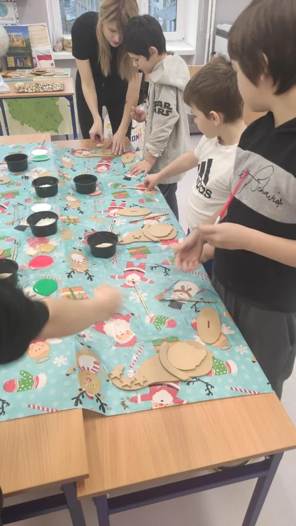 Opis do zdjęć: Uczniowie składają i malują figurki krasnali z drewna