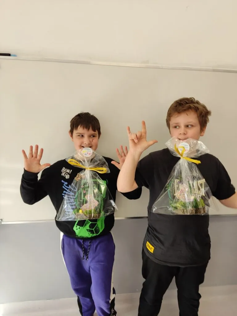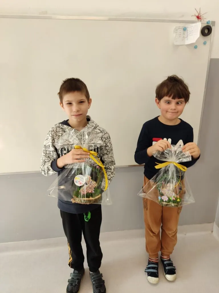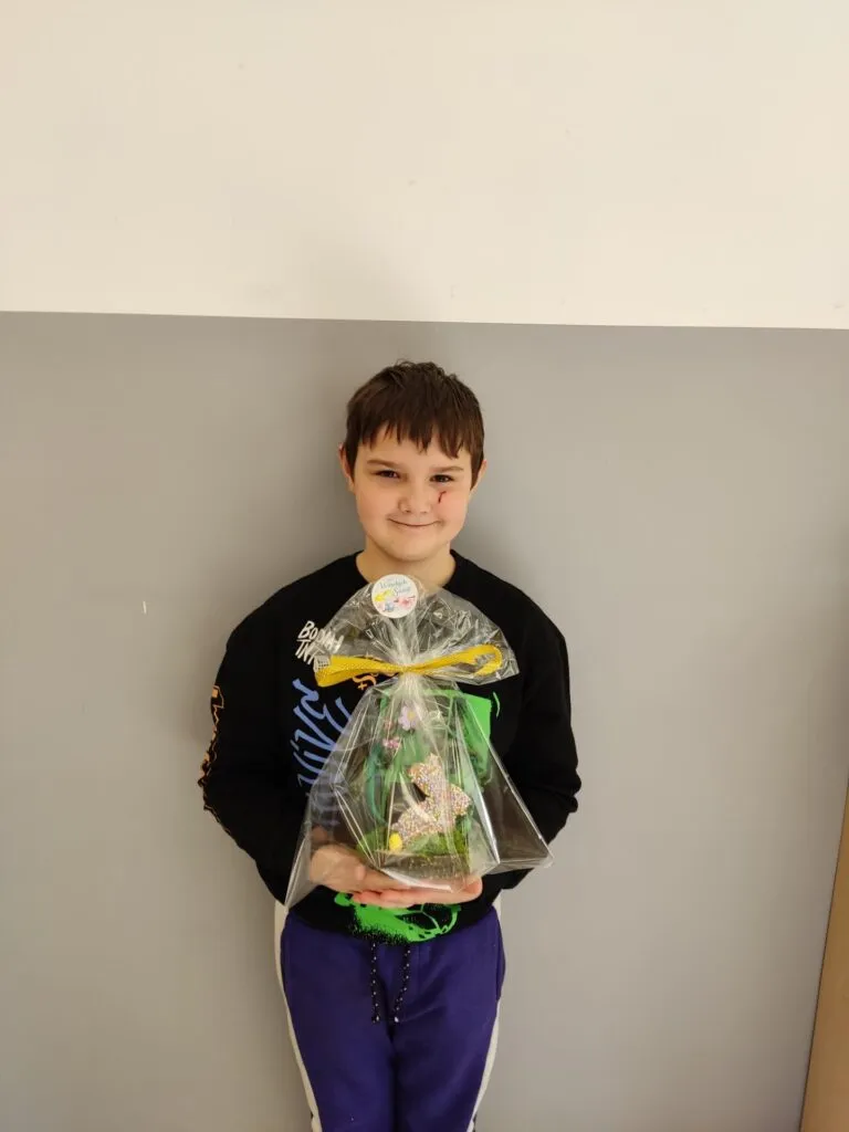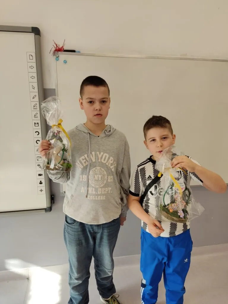 Zdjęcia przedstawiają uczniów z wykonanymi przez siebie stroikami wielkanocnymi
