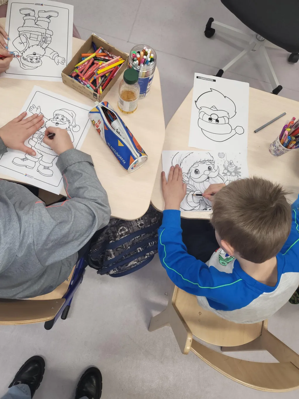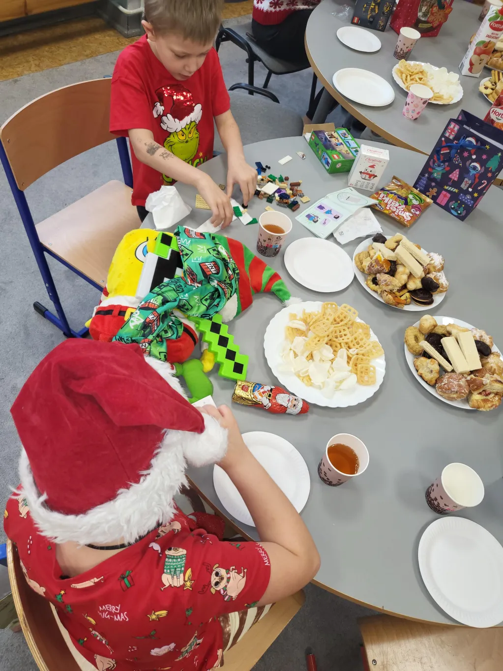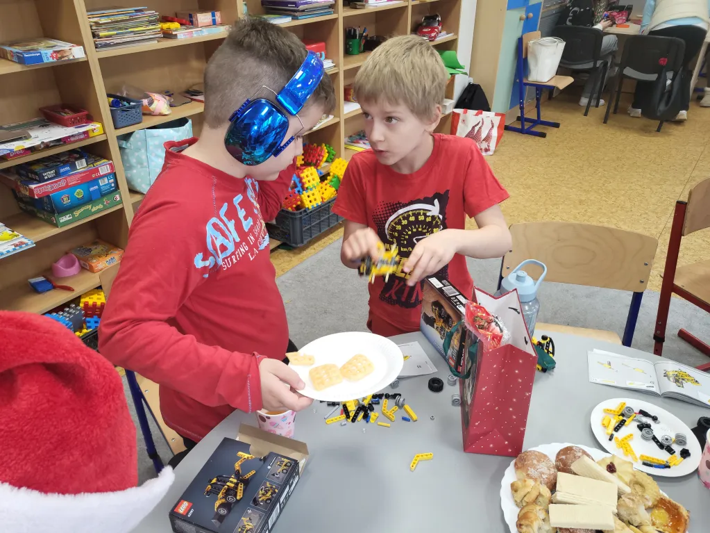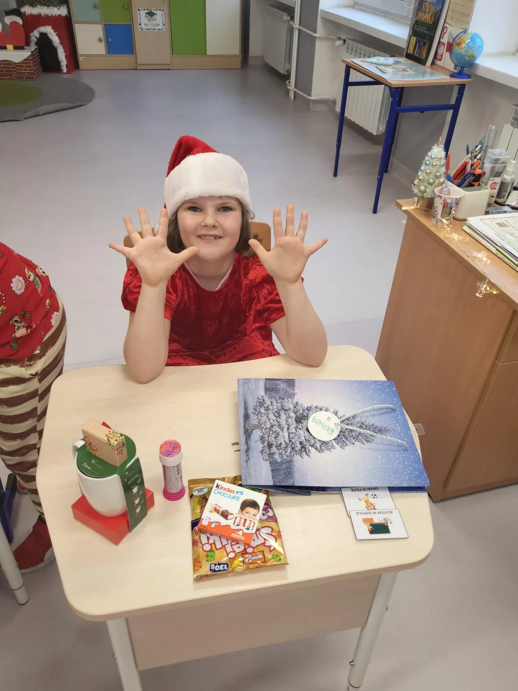 Szczególnym wydarzeniem były Mikołajki – dzień pełen uśmiechów i radości. Dzieci otrzymały wspaniałe upominki, którymi cieszyły się przez cały dzień. Dzięki zaangażowaniu i wsparciu Rodziców oraz Opiekunów mogliśmy również zorganizować tego dnia poczęstunek dla uczniów, za co serdecznie dziękujemy.