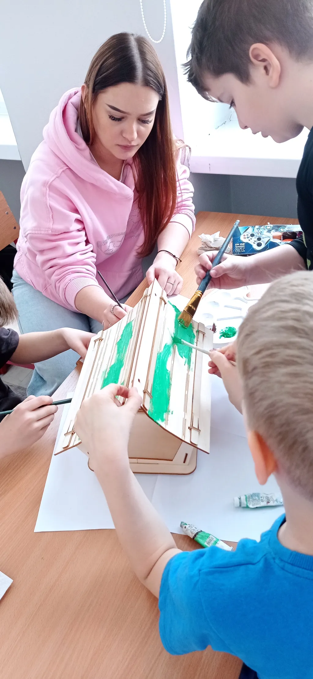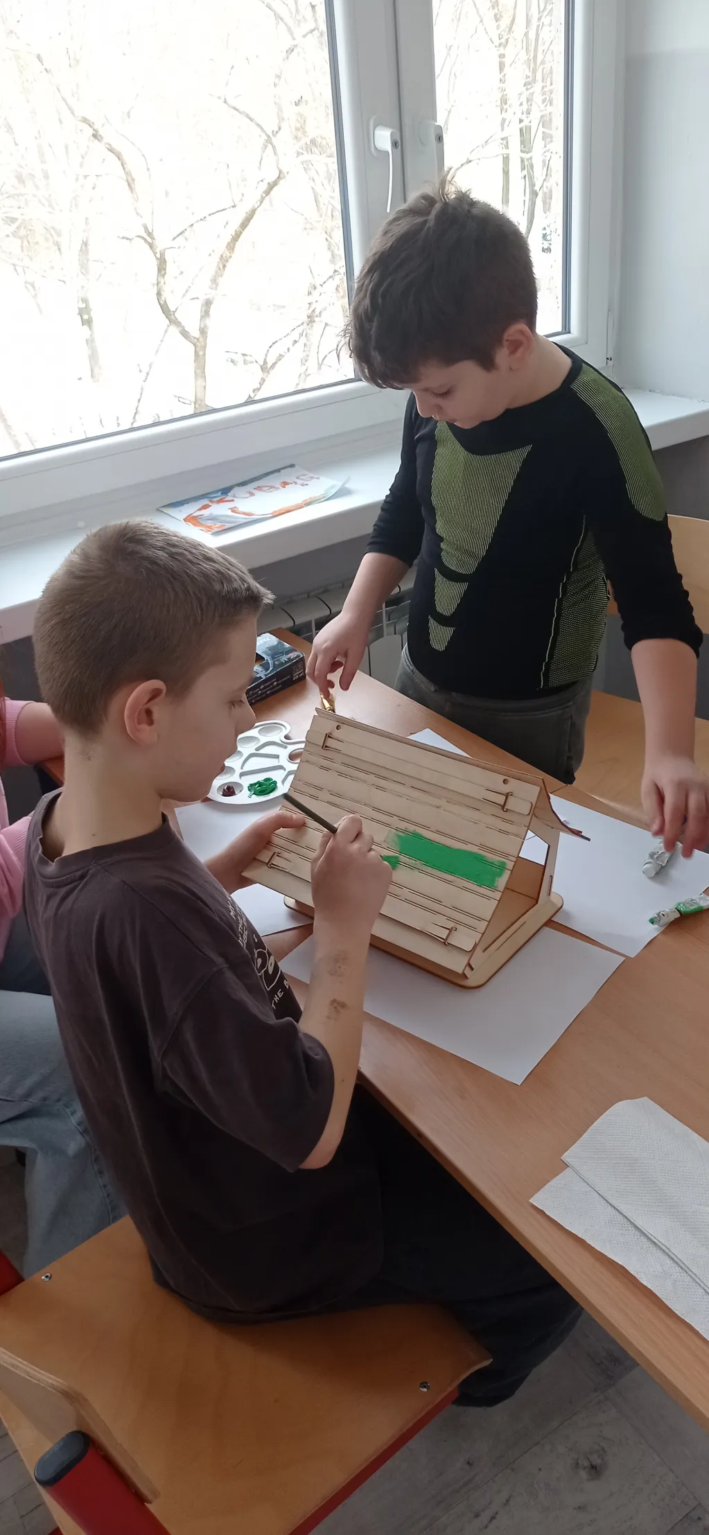 Uczniowie wspólnie złożyli karmnik, następnie pomalowali go, aby mógł zostać wystawiony na drzewie i służyć ptakom jako miejsce dokarmiania w okresie zimowym.